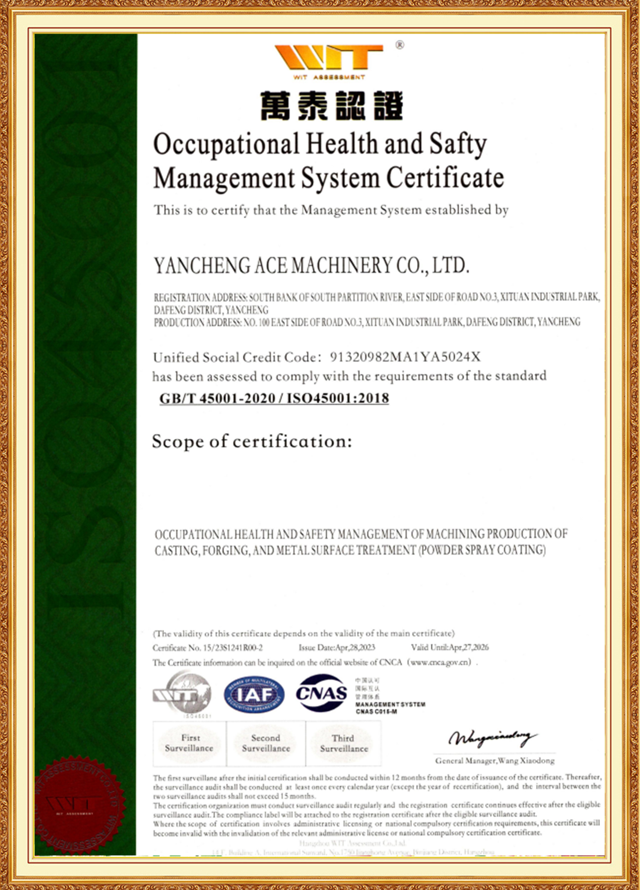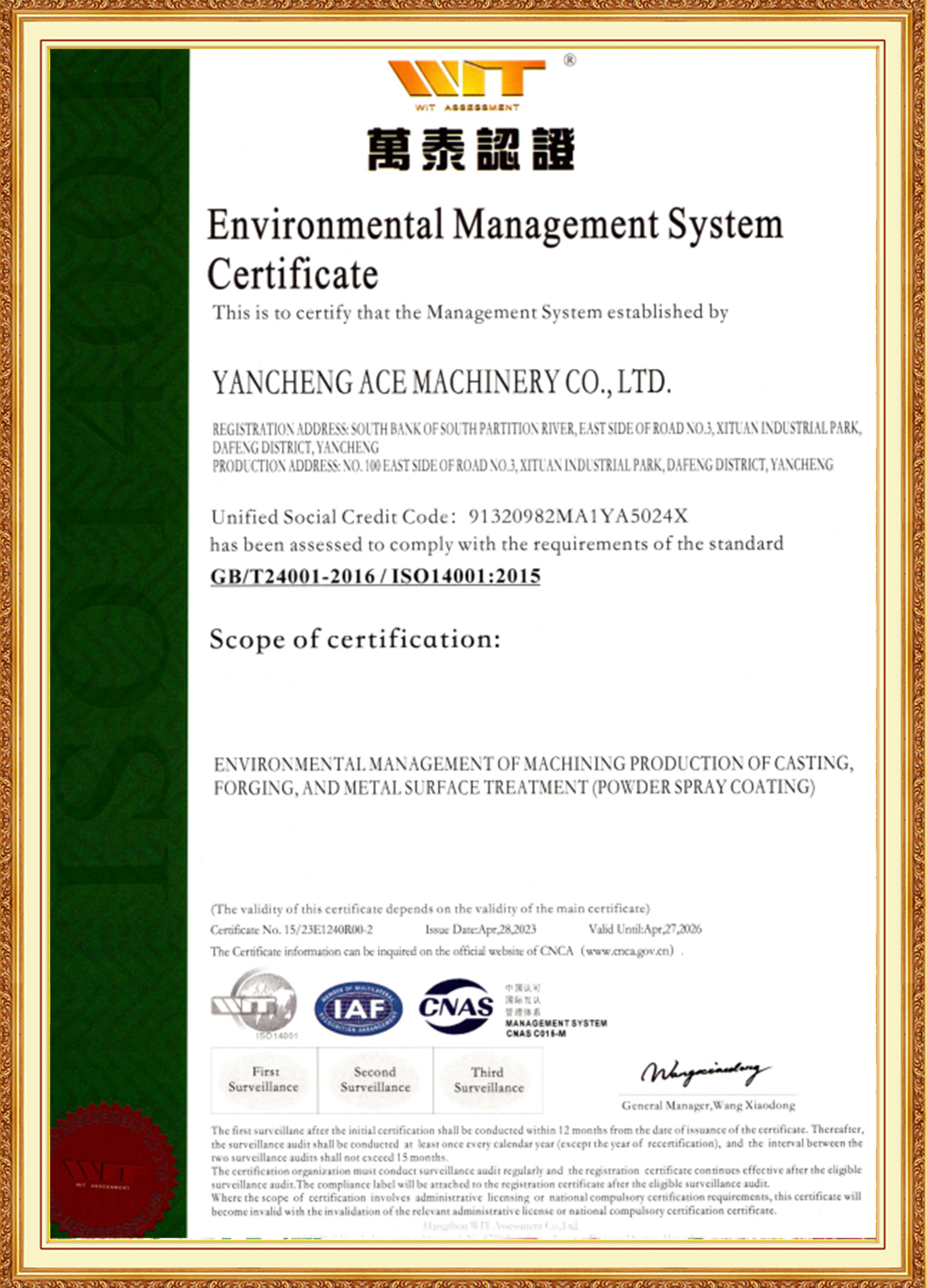 এসিই গ্রুপ উপকরণ, তাপ চিকিত্সা, মেশিনিং, এবং পৃষ্ঠ চিকিত্সা শিল্প অভিজ্ঞ যারা তরুণ মূল সদস্যদের একটি ব্যবস্থাপনা দল দ্বারা সমর্থিত. তারা আন্তর্জাতিক এবং দেশীয় মান, অগ্রগামী, এবং উদ্ভাবনের জন্য প্রতিশ্রুতিবদ্ধ। সাবসিডিয়ারি ACE মেশিনারি TÜV Rheinland ISO 9001 কোয়ালিটি ম্যানেজমেন্ট সিস্টেম সার্টিফিকেশন, সেইসাথে ISO 14001, 45001, এবং 50001 সিস্টেম সার্টিফিকেশন পাস করেছে। এটি একটি বিশেষায়িত, পরিমার্জিত, অনন্য, এবং উদ্ভাবনী এন্টারপ্রাইজ, একটি জাতীয় উচ্চ-প্রযুক্তি উদ্যোগ হিসাবে স্বীকৃত এবং একটি 3A-স্তরের এন্টারপ্রাইজ ক্রেডিট রেটিং রয়েছে।